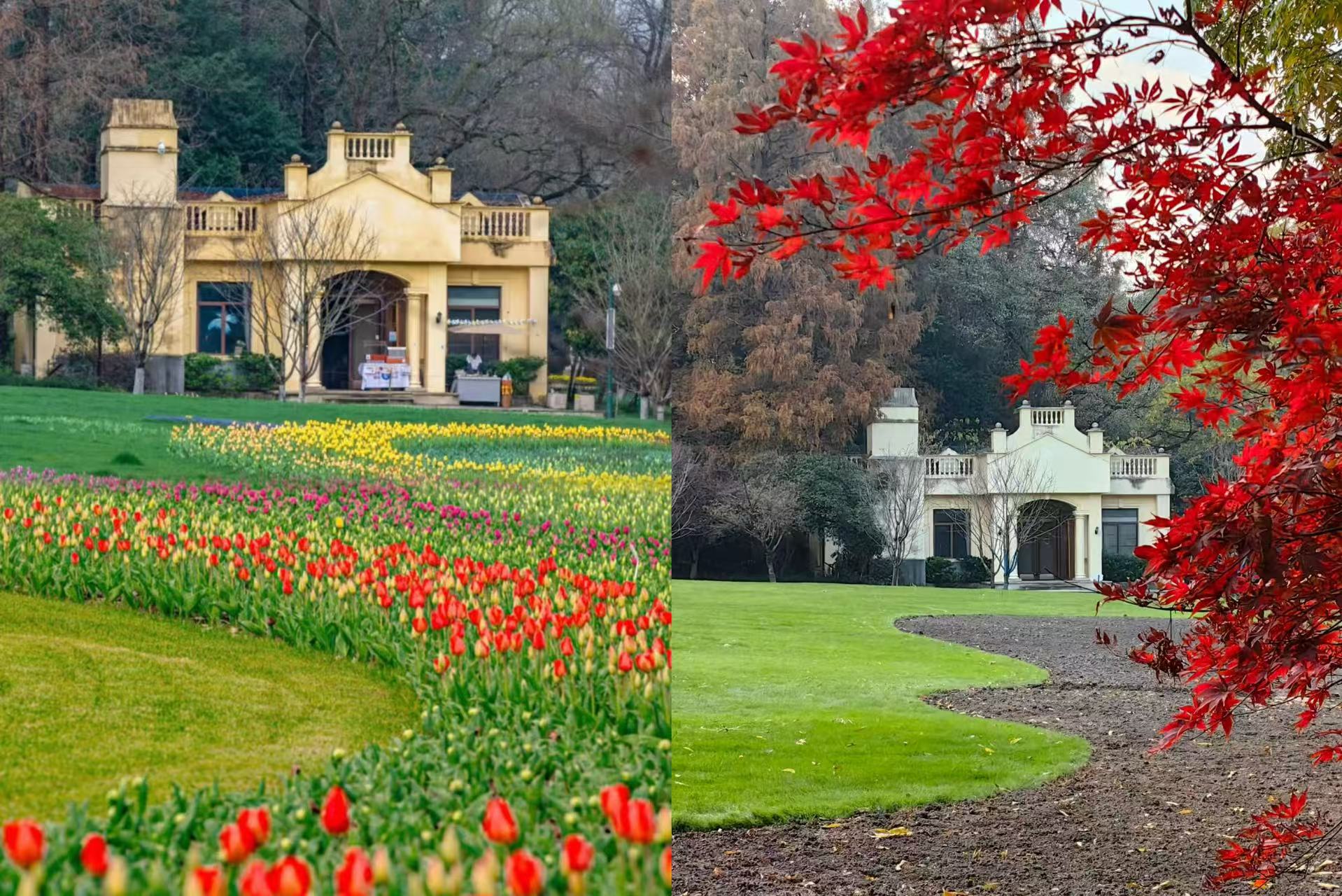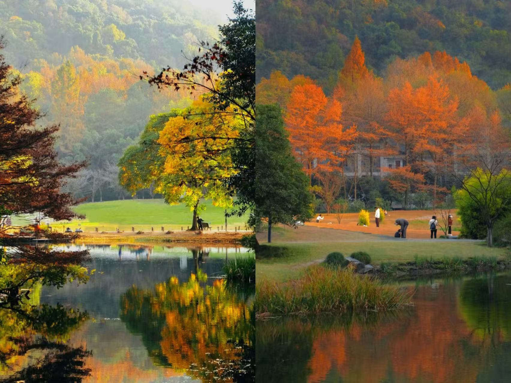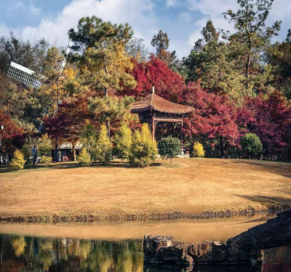 晚秋的风簌簌吹过, 在这样层林尽染的静谧中并肩, 听见落叶在脚下细碎作响, 别提多惬意了! 往前走,靠近逍遥坡那头, 还有一架悠然转动的大风车。 每年的十一月、十二月, 坡上灿若云霞的枫香与乌桕, 为风车染上温暖的秋意。
